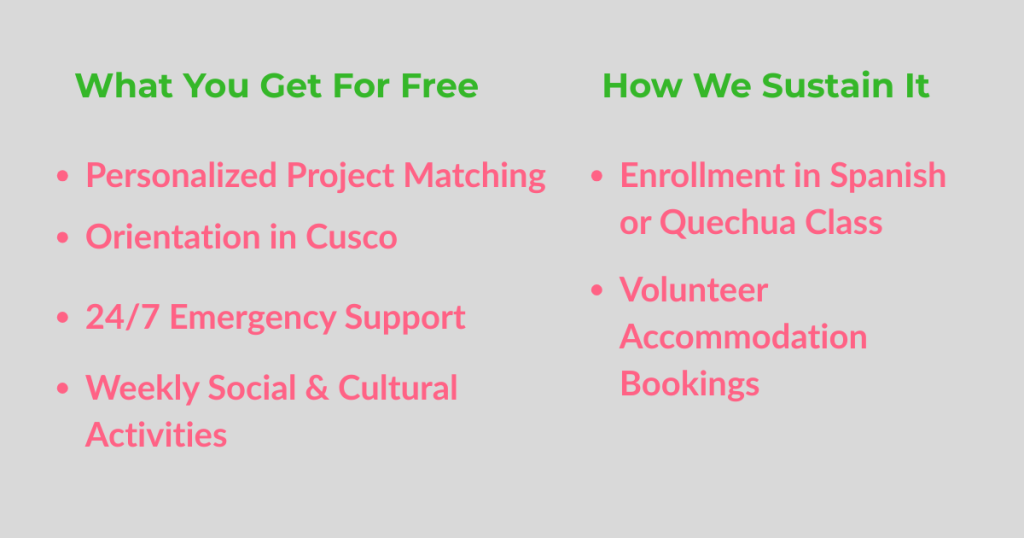 Your Living Costs: You pay for your own accommodation (Volunteer House or Homestay) and Spanish (or Quechua) lessons at our standard local rates.